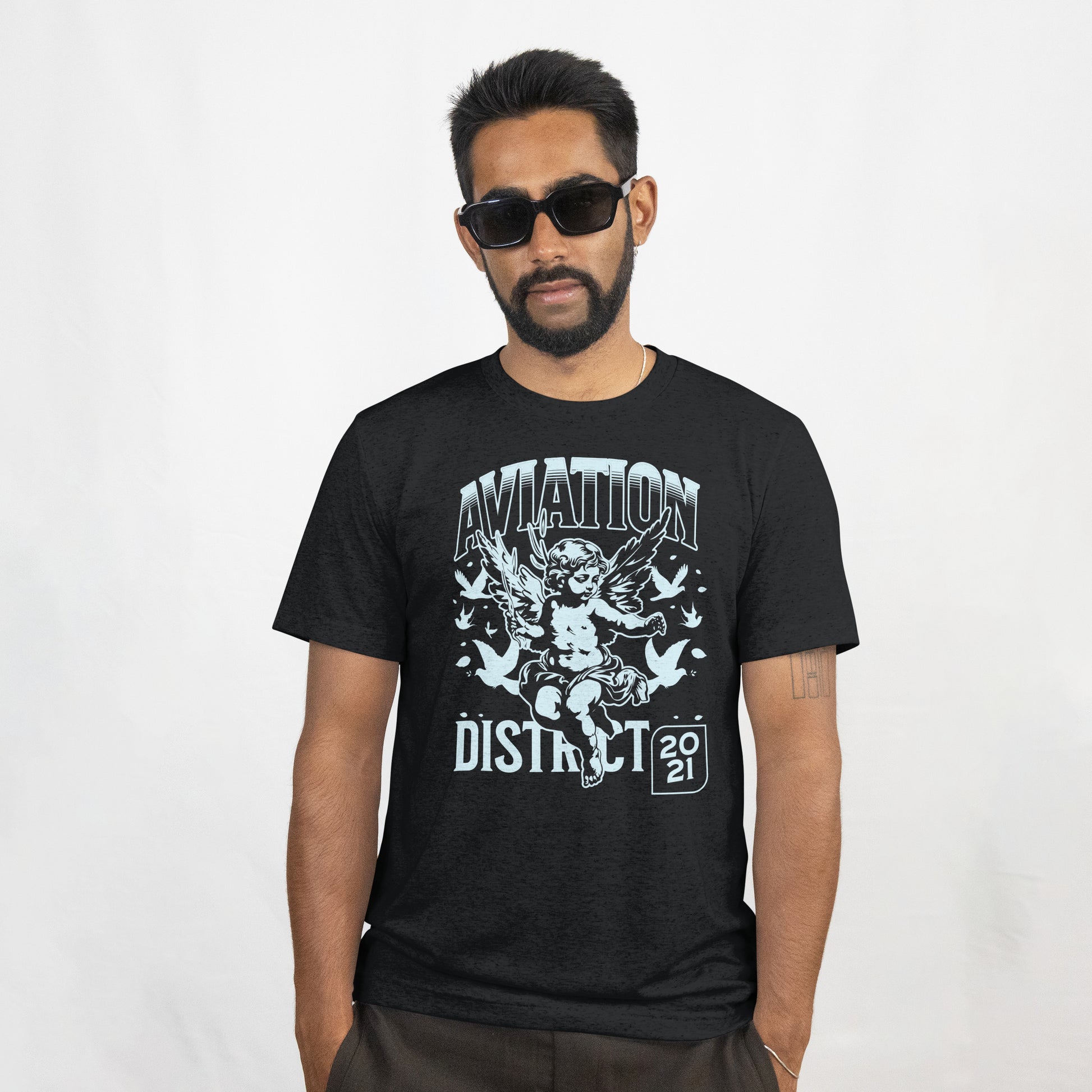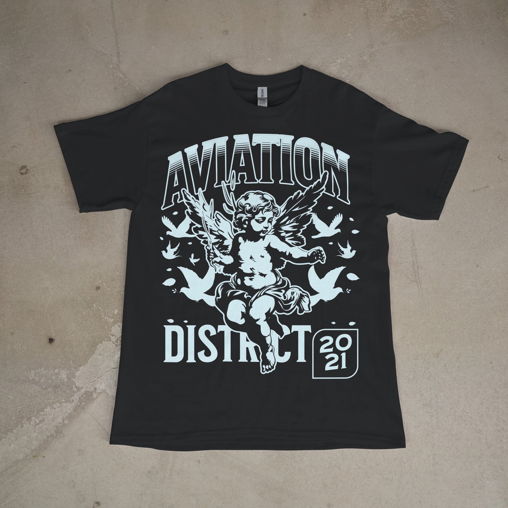 Elevate your streetwear game with the signature Aviation District "Cherub" Tee. This bold black t-shirt features a striking vintage-style graphic of a cherub surrounded by doves, symbolizing freedom, flight, and artistic rebellion. The oversized print is accented with the brand's name Aviation District in bold, collegiate-style lettering, along with a "2021" badge that marks its timeless drop year.